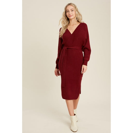 Cozy sweater dress featuring a super-soft and stretch rib knit fabric, surplice v-neckline, dolman sleeves, relaxed body-con silhouette, comes with waist tie.
