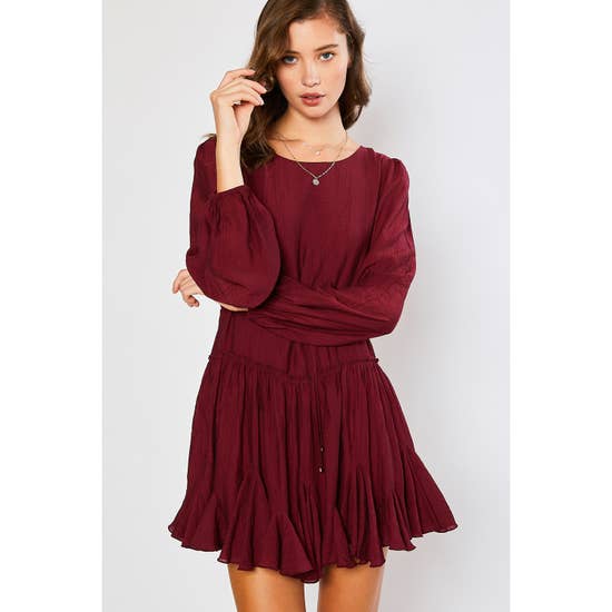 Mini swing dress featuring a round neck, long balloon sleeves with elasticated cuffs, and an adjustable waist with string belt, features ruffles accent hem.