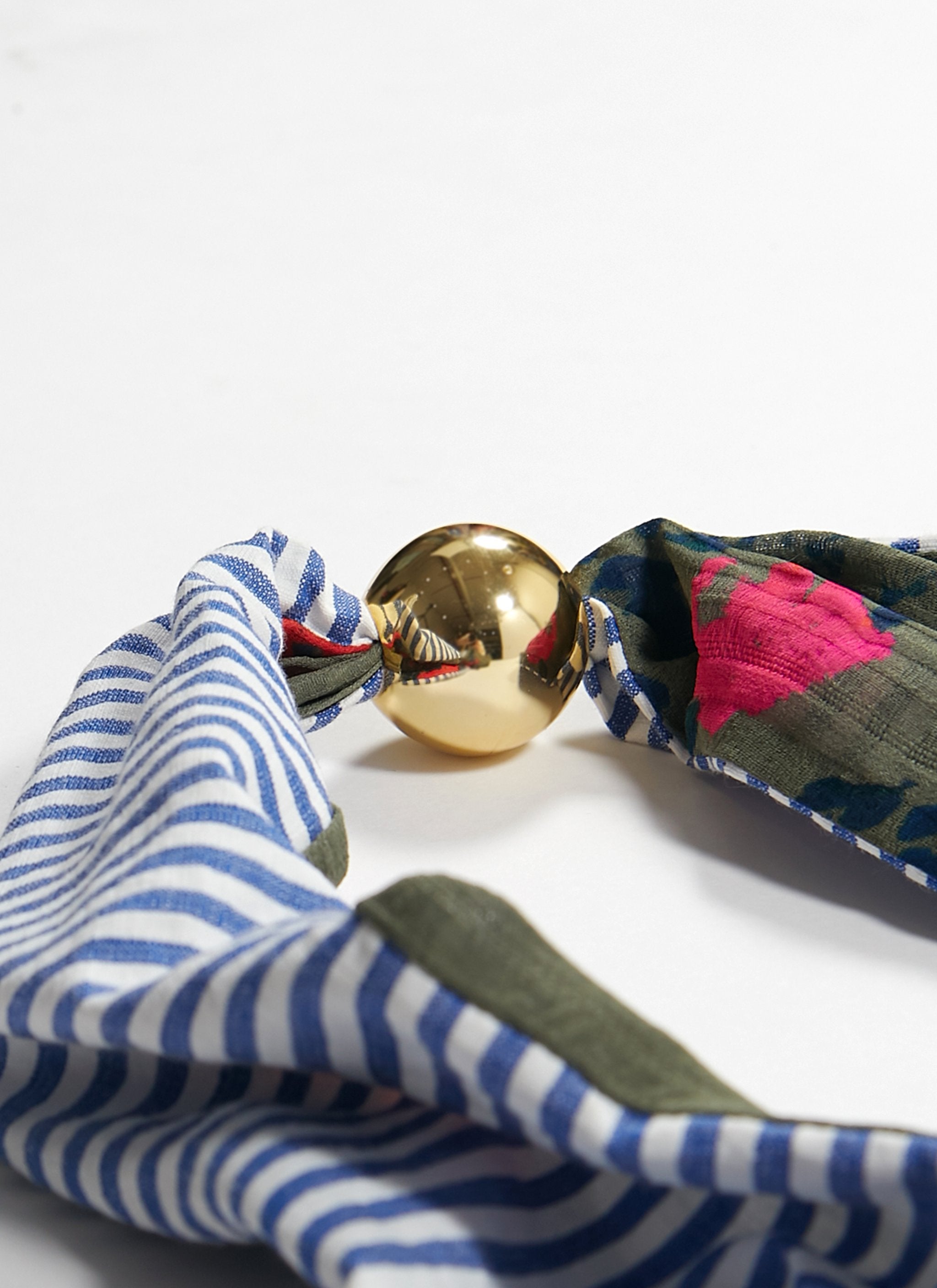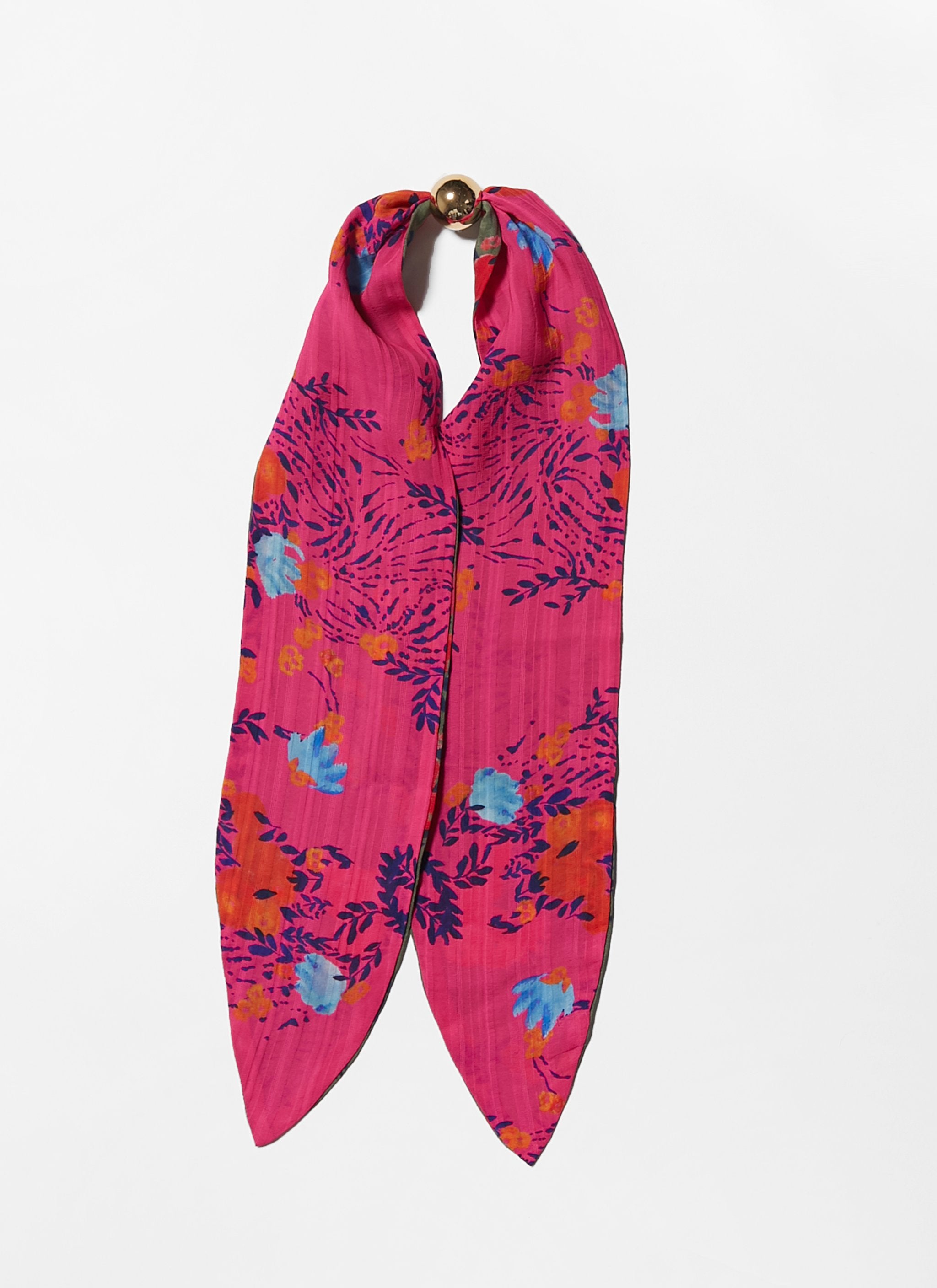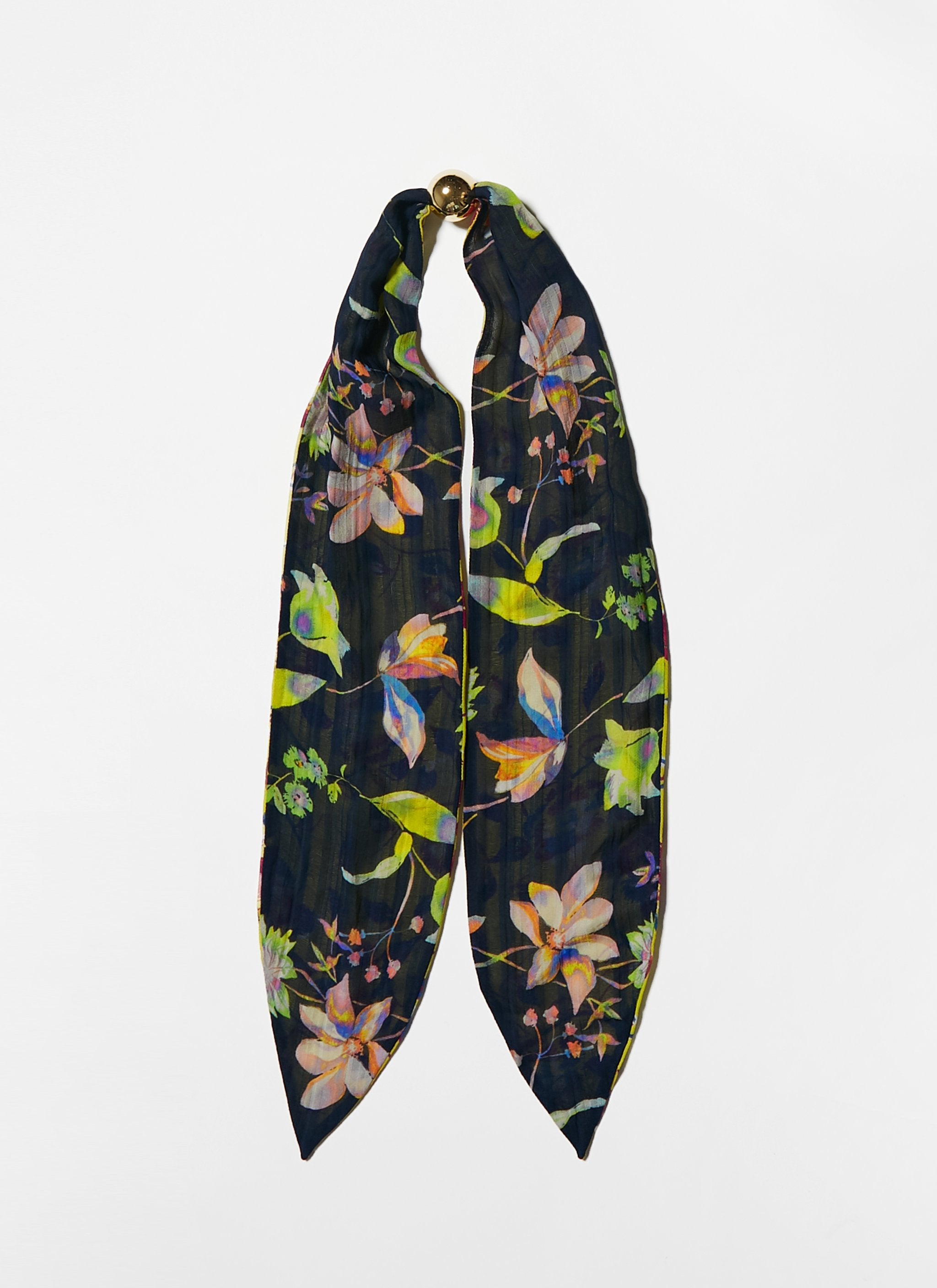 Our versatile, silk Kelly scarf is the perfect pop of print, with a decorative gold ball detail. Comes in five reversible styles. Can be worn as a headband, choker, bracelet...