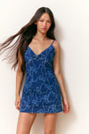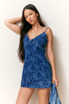 Denim dreams come true with the Solina Dress. This playful mini dress has our signature Luna Rosa Beaux print lasered into the denim for a feminine touch. The body-hugging piece features a wash effect, adjustable spaghetti straps, and a top-applied bow accent at the front. This piece is finished with a zipper.