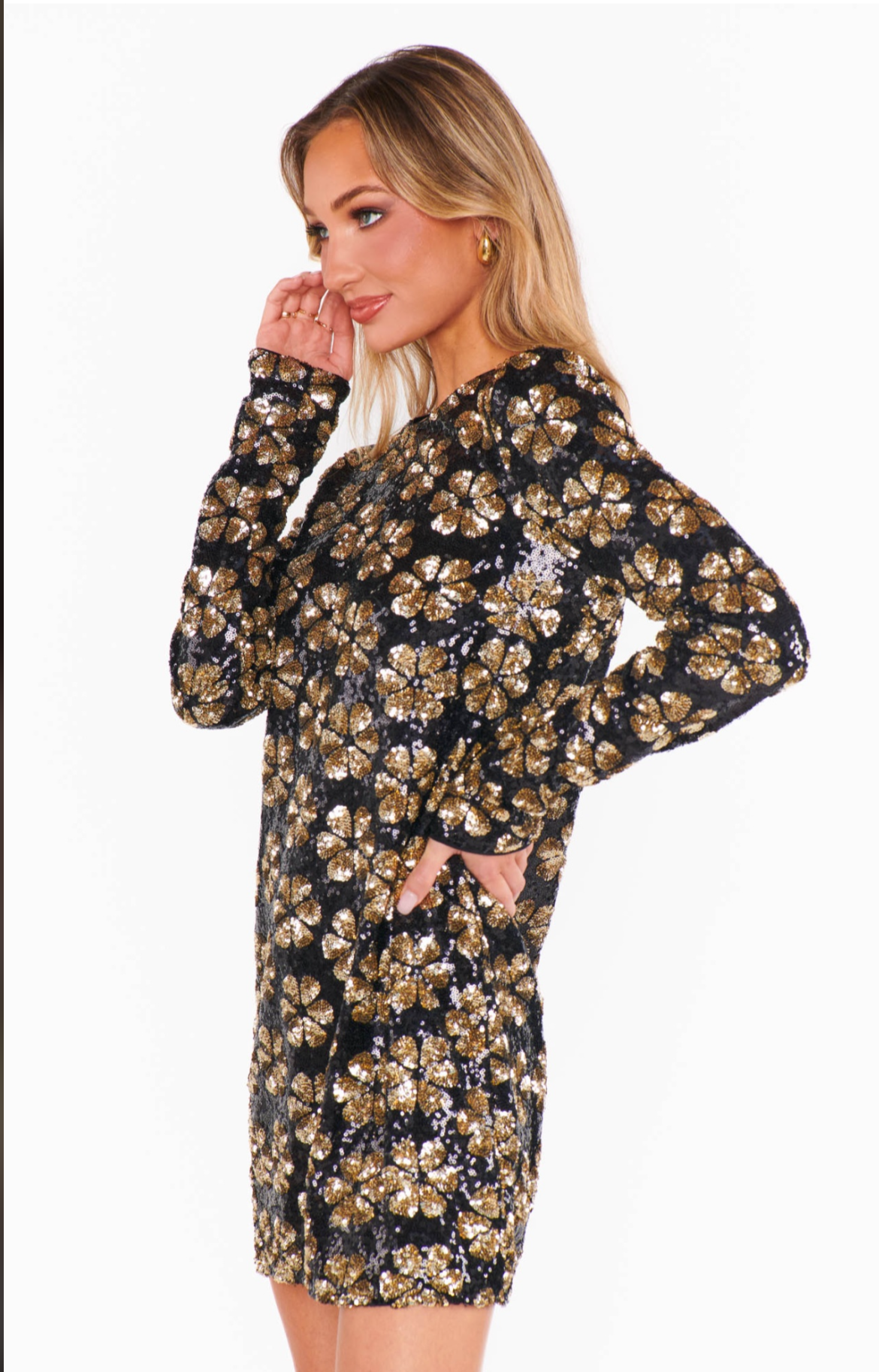 The going out dress every girl needs in her wardrobe! This chic, flowy sequin mini features flower pop gold sequins and an easy fit. Feel comfy and stylish all at...