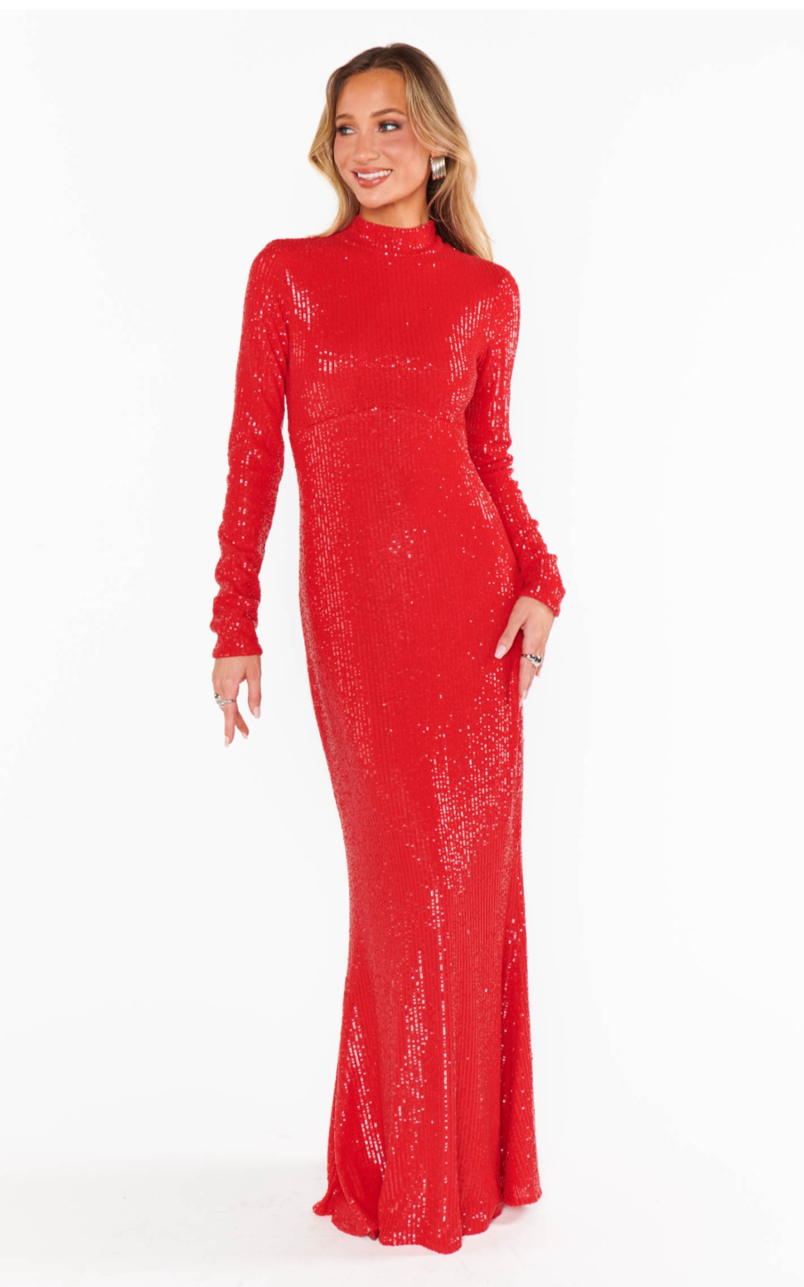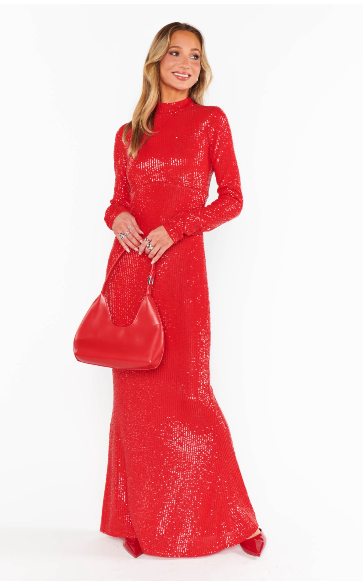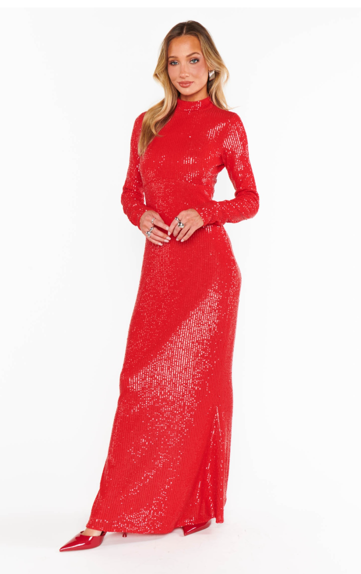 When you're ready to glow, the All Out Maxi is your go-to. A bodycon fit maxi, embellished with Red Sequins and an elegant turtleneck, this dress has everything you need...