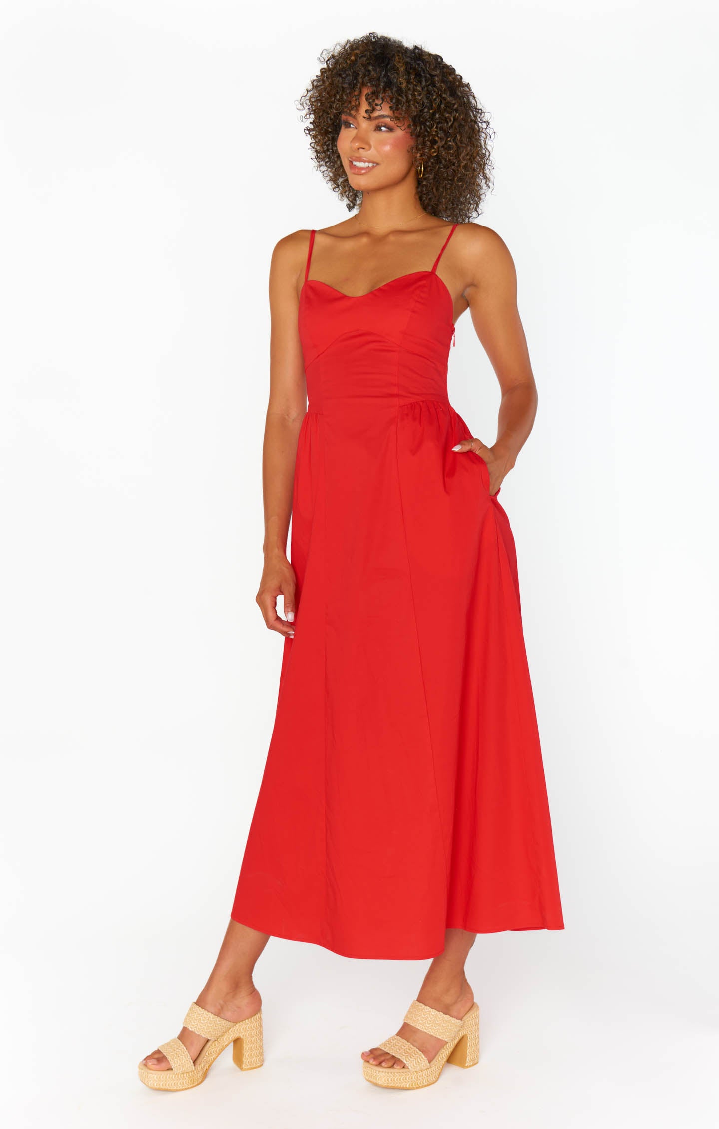 Twist and turn in this red poplin midi! This flowy dress is adorned with a sweetheart neckline and comfortable smocked back. Dress it up with a pair of strappy heels...