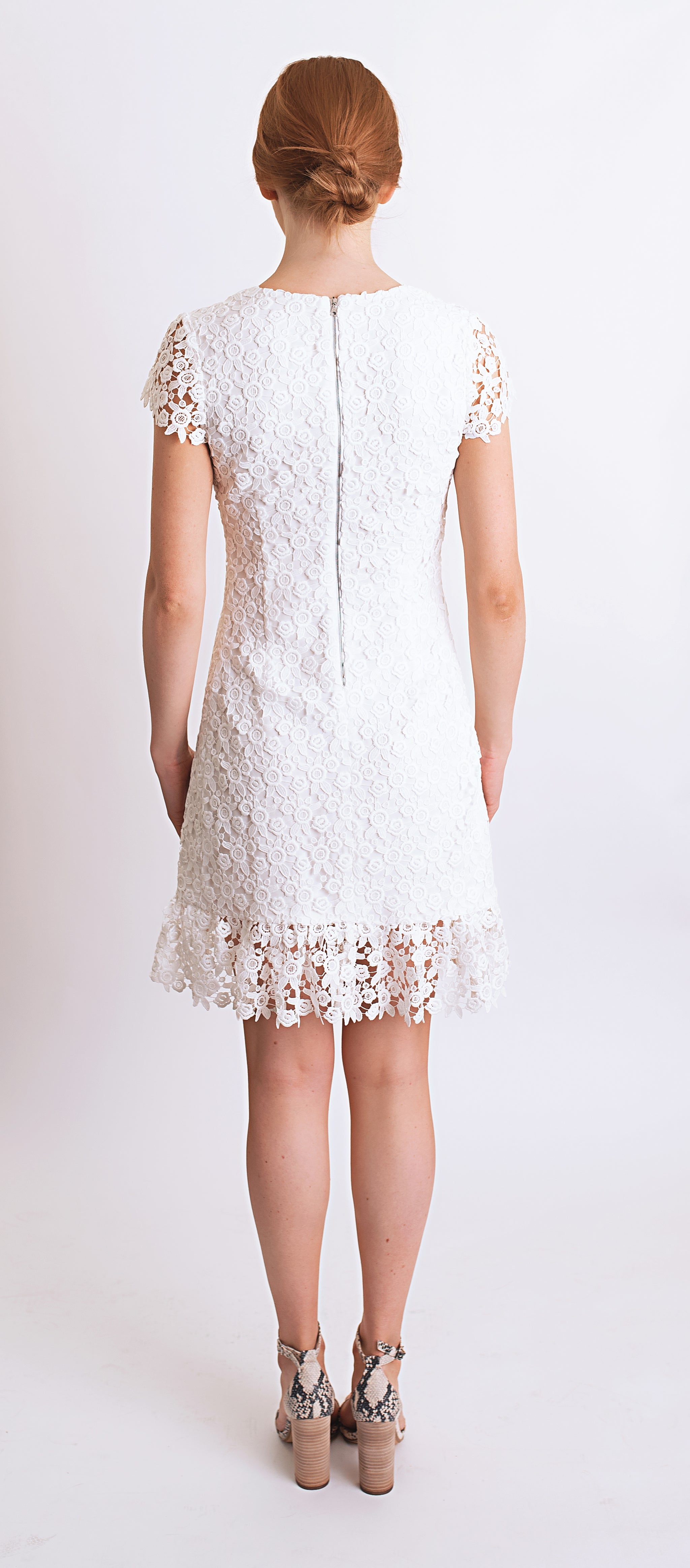 White lace dress features sheer cap sleeve accent and sheer lace hem, with back zipper. The perfect dress for your Boston graduation, your Andover bridal showers, or your trips to...